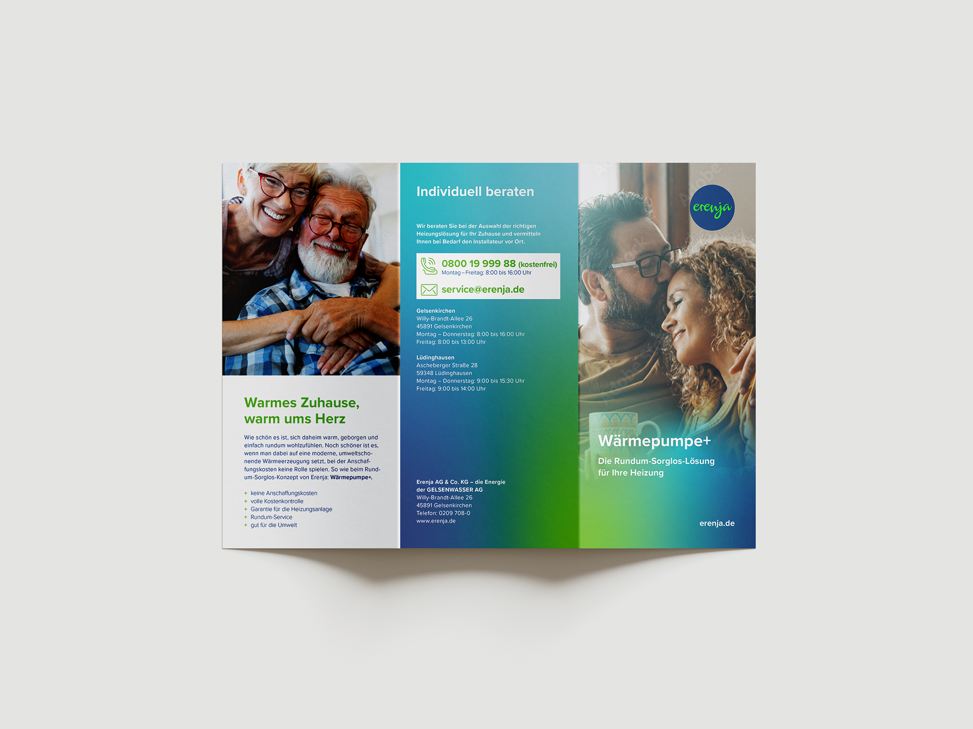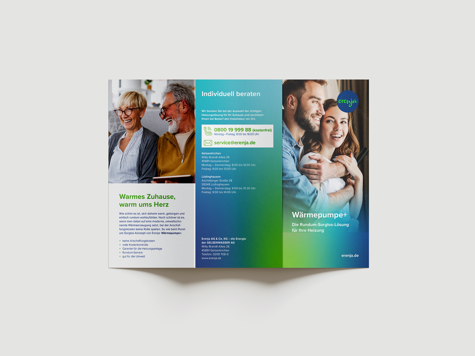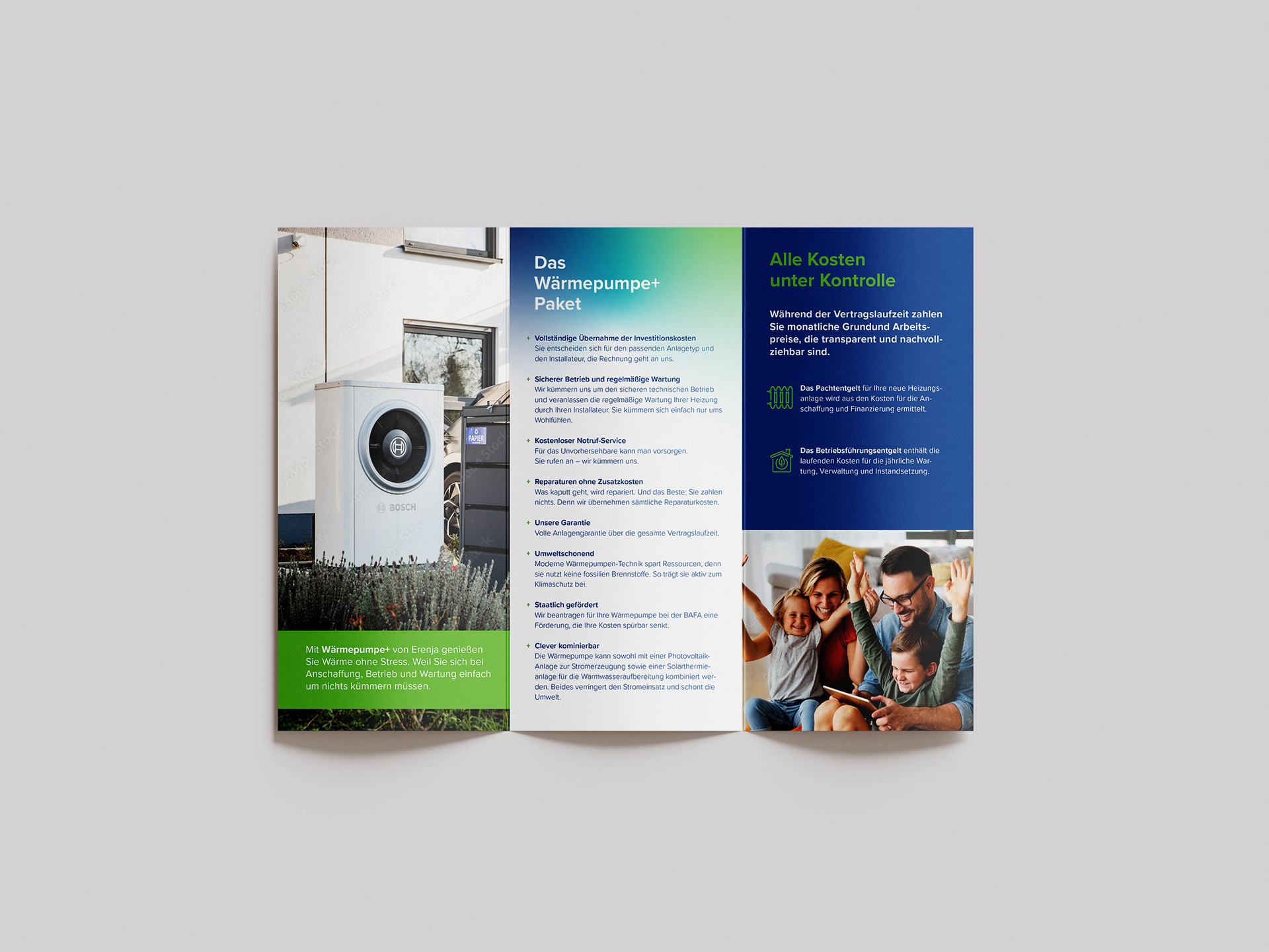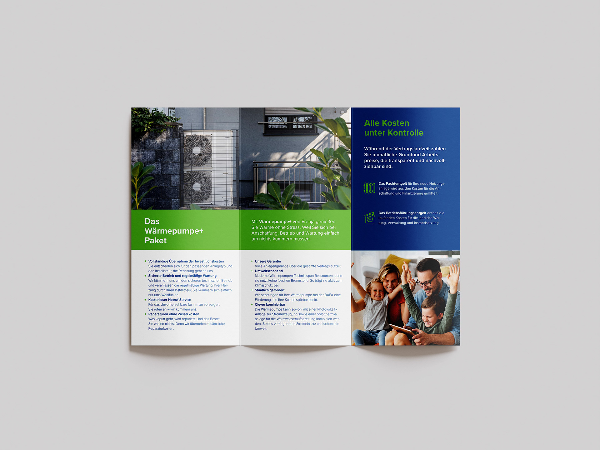 Im Rahmen meiner Arbeit für Erenja habe ich zwei unterschiedliche Flyer für das Wärmepumpe+ Paket gestaltet. Dabei lag der Fokus darauf, die Vorteile des Pakets prägnant und visuell ansprechend darzustellen, um potenzielle Kunden gezielt anzusprechen und zu informieren.