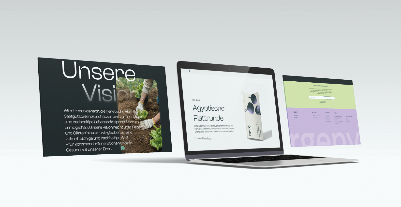 Rgeny ist ein fiktives Unternehmen, das im Rahmen des Moduls Interaktive Medien während meines Studiums entwickelt wurde. Die Initiative wurde als Konzept entworfen, um auf die Themen Erhalt der Artenvielfalt und nachhaltige Ernährung aufmerksam zu machen.